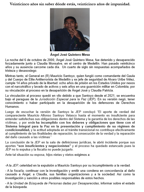 A los 25 años de la desaparición forzada de Ángel José Quintero Mesa compartimos el comunicado de su familia.