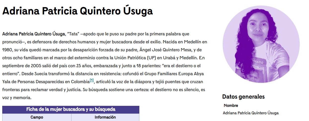Para conocer mejor las vicisitudes por las que atraviesan las familias víctimas de una desaparición forzada (en este caso numerosas) les invitamos a que visiten la biografía de Adriana Quintero como mujer buscadora en la enciclopedia de Banrepcultural.